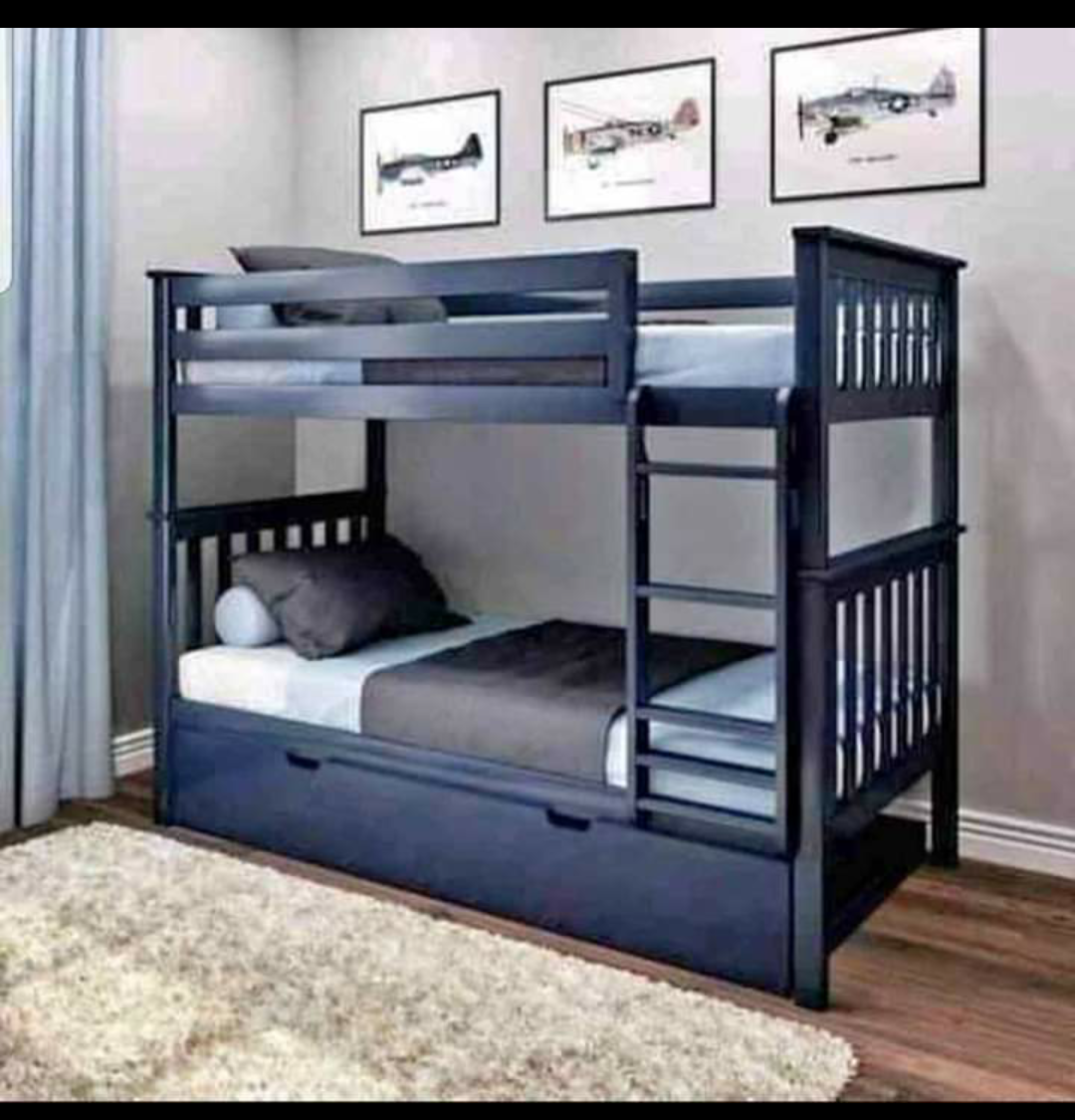 Christine design, double bunk bed with storage drawers at the bottom, or an extra pullout (underbed) bed on wheels. painted using water-based paint, eco-friendly, with safety rails for child protection. Made using pine wood, strong and sturdy.